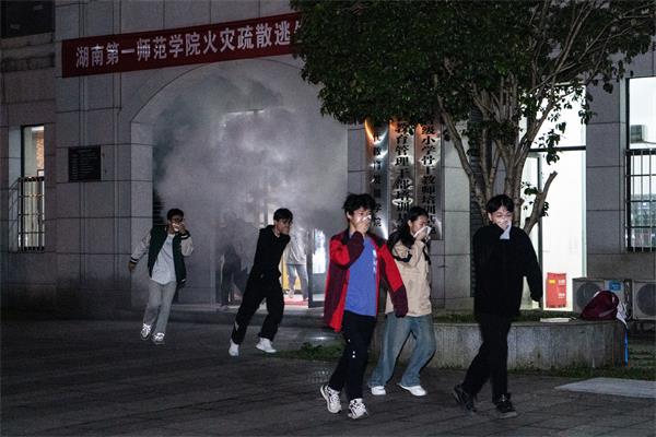 本次演练为模拟学校培训楼5楼发生火灾、4名学生被困的场景。4月10日傍晚18:30,5楼楼道内涌出滚滚浓烟。“起火啦!”临近人员发现着火后,第一时间使用灭火器进行扑救,大声呼喊,并按下最近的手动报警器,消防控制室值班人员接到警报后,立即通知学校志愿消防队伍赶赴现场扑救,并拨打报警电话,同时向学校应急指挥部报告。学校应急指挥部立即启动应急预案,安全警戒组、医疗救护组、灭火行动组、疏散引导组等应急小组随即到位,学生们迅速有序地从宿舍撤离到安全区域。