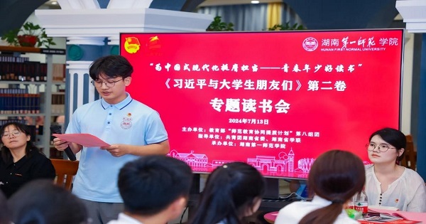 7月13日晚,在共青团湖南省委、湖南省学联指导下,“为中国式现代化挺膺担当——青春年少好读书”湖南省2024年主题读书季——《习近平与大学生朋友们》第二卷专题读书会在我校举办。团省委学校部四级调研员、省学联副秘书长周帆,我校团委负责人,湖南省学联代表、教育部“师范教育协同提质计划”第八组团高校师生代表及我校师生代表共计100余人参会。读书会由我校“润之”师生宣讲团团支书孟醒主持。