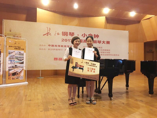 6月24日,由中国高等教育学会主办的“长江钢琴·小金钟2017全国高校钢琴大赛”湖南预选赛在湖南师范大学音乐学院落下帷幕。我校音乐舞蹈学院教师樊小欢与徐稳合作参加了此项赛事的四手联弹及双钢琴组比赛,最终两人以优异的表现荣膺该组金奖(第一名),并自动获得代表湖南赛区参加全国决赛的资格。